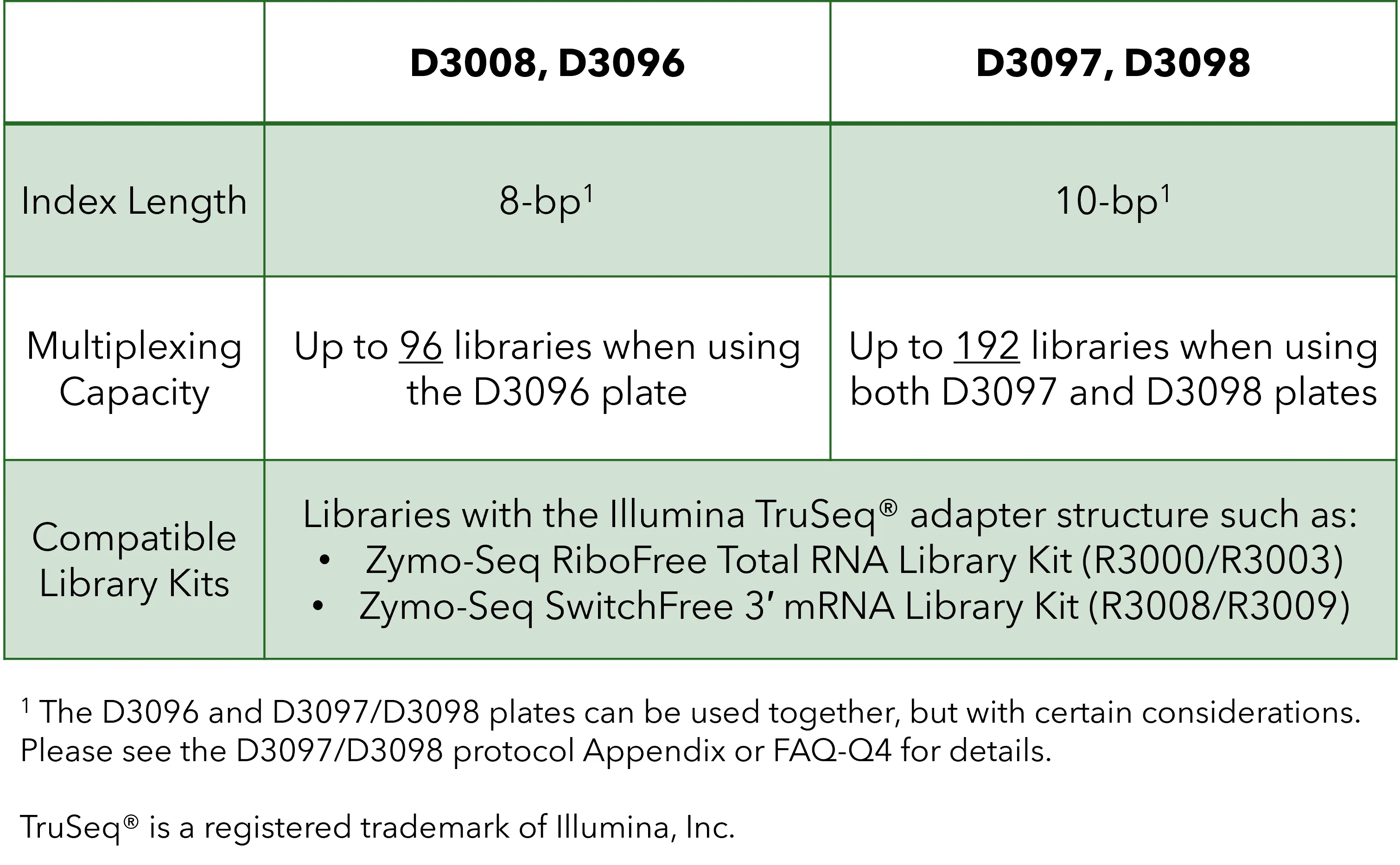 Indexed libraries are compatible with any Illumina® sequencer. These indexes are compatible with the Zymo-Seq RiboFree Total RNA Library Kit and Zymo-Seq SwitchFree 3′ mRNA Library Kit. For greater multiplexing capability, consider the Zymo-Seq UDI Primer Plate (Indexes 1-96, 10-bp) and the Zymo-Seq UDI Primer Plate (Indexes 97-192, 10-bp) (Cat. No. D3097 and D3098 respectively). These plates can be used together to multiplex up to 192 libraries.