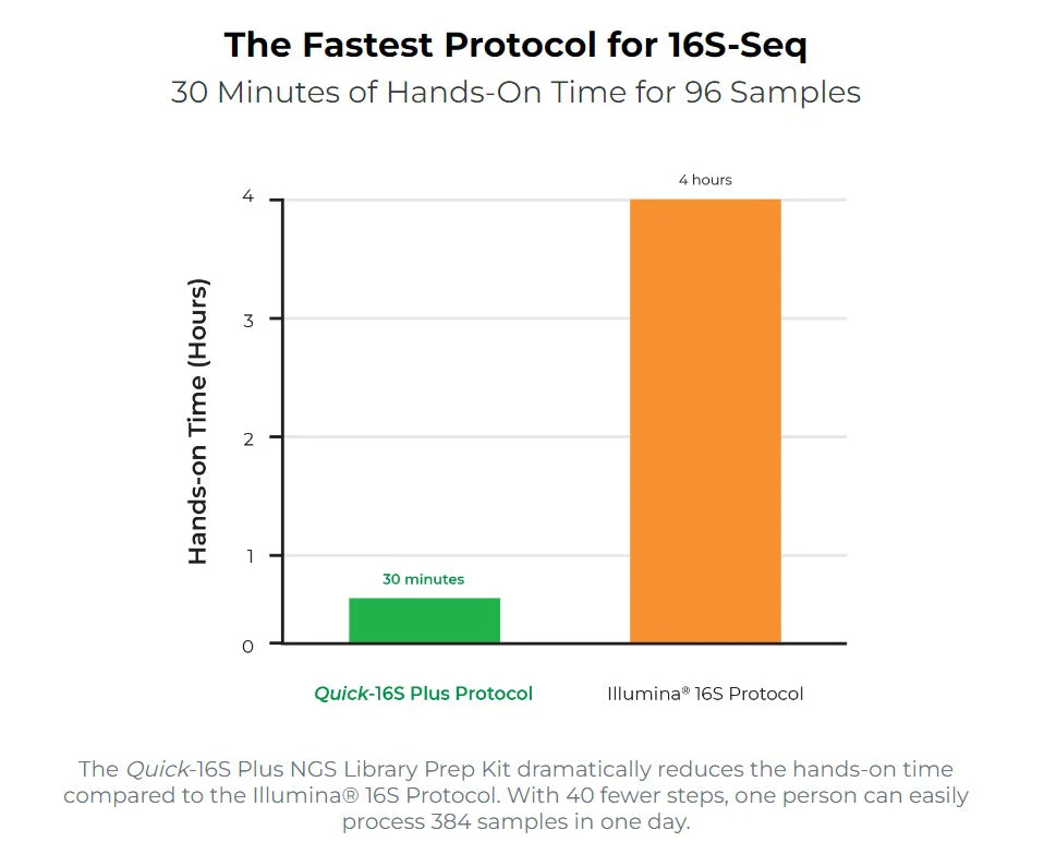 The Quick-ITS Plus NGS Library Prep Kit (UDI) is the fastest and simplest NGS library prep targeting the ITS region for high-throughput sequencing, now with unique dual indexing for improved barcode resolution. The automation-friendly protocol utilizes a single qPCR/PCR for combined targeted amplification and barcode addition using specially designed primers. After pooling by equal volume, a single clean-up of the final library is performed, rather than massive AMPure® bead-based clean-ups. Additional library quantification analysis such as TapeStation® analysis or gel electrophoresis are not necessary. With these features, the workflow dramatically reduces the hands-on time of library preparation to only 30 minutes.
