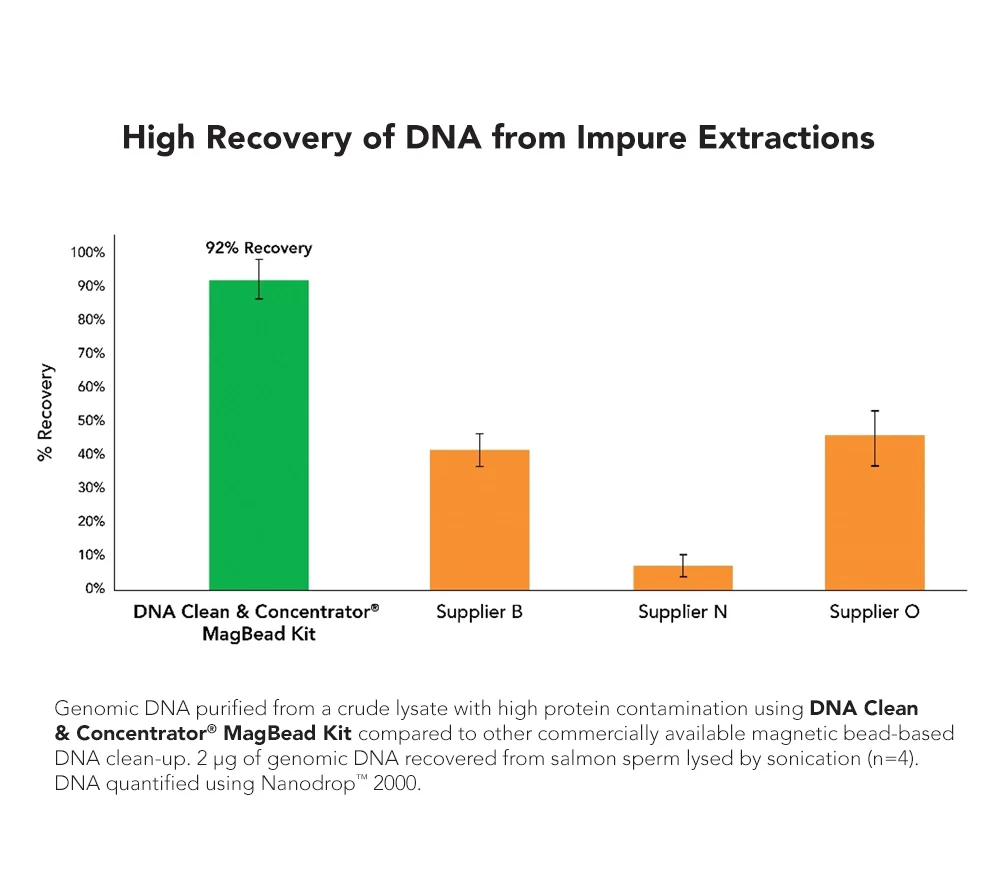 The DNA Clean & Concentrator MagBead Kit is magnetic bead based clean-up kit that can purify DNA from PCR, enzymatic reactions, impure extractions, and other sources. The MagBinding Bead technology provides a rapid and scalable workflow that can be adapted for low to high-throughput automated method for purification and concentration of DNA.