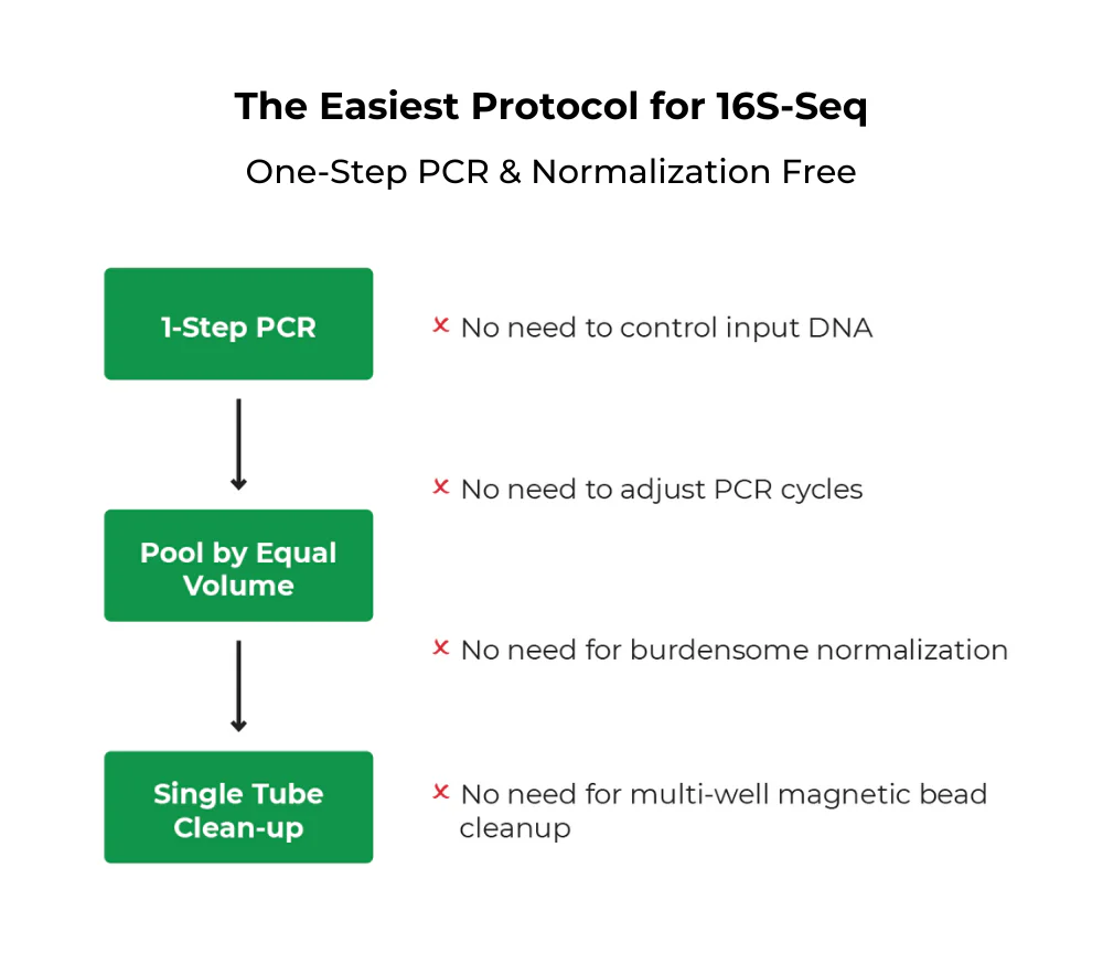The Quick-16S Plus NGS Library Prep Kit (V1-V3) is the fastest and simplest NGS library prep targeting the V1-V3 region of the 16S rRNA gene for high-throughput sequencing. The automation-friendly protocol utilizes a single qPCR/PCR for combined targeted amplification and barcode addition using specially designed primers. After pooling by equal volume, a single clean-up of the final library is performed, rather than massive AMPure® bead-based clean-ups. Additional library quantification analysis such as TapeStation® analysis or gel electrophoresis are not necessary. With these features, the workflow dramatically reduces the hands-on time of library preparation to only 30 minutes.
